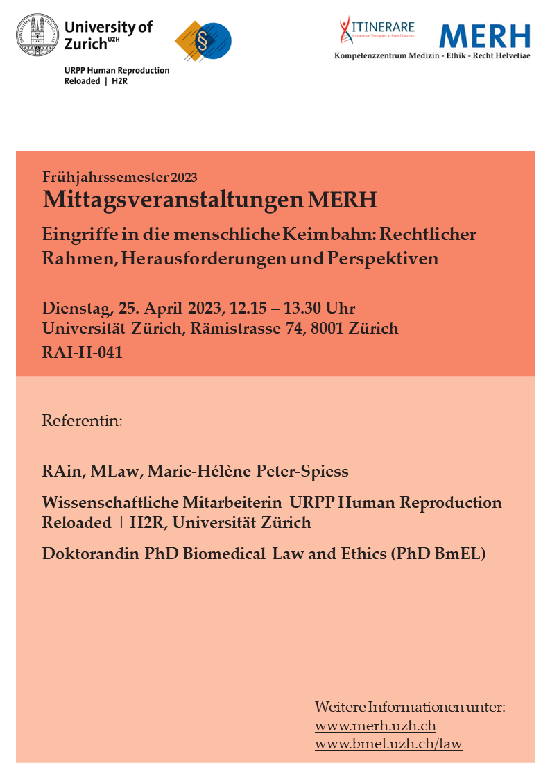 Am Dienstag, 25. April 2023, von 12.15 - 13.30 Uhr findet an der UZH im Raum RAI-H-041 die erste Mittagsveranstaltung des Kompetenzzentrums MERH statt. Frau RAin Marie-Hélène Peter-Spiess, wissenschaftliche Mitarbeiterin beim UFSP H2R, wird die Thematik des Human Genome Editing beleuchten und ein Referat mit dem Titel "Eingriffe in die menschliche Keimbahn: Rechtlicher Rahmen, Herausforderungen und Perspektiven" halten.