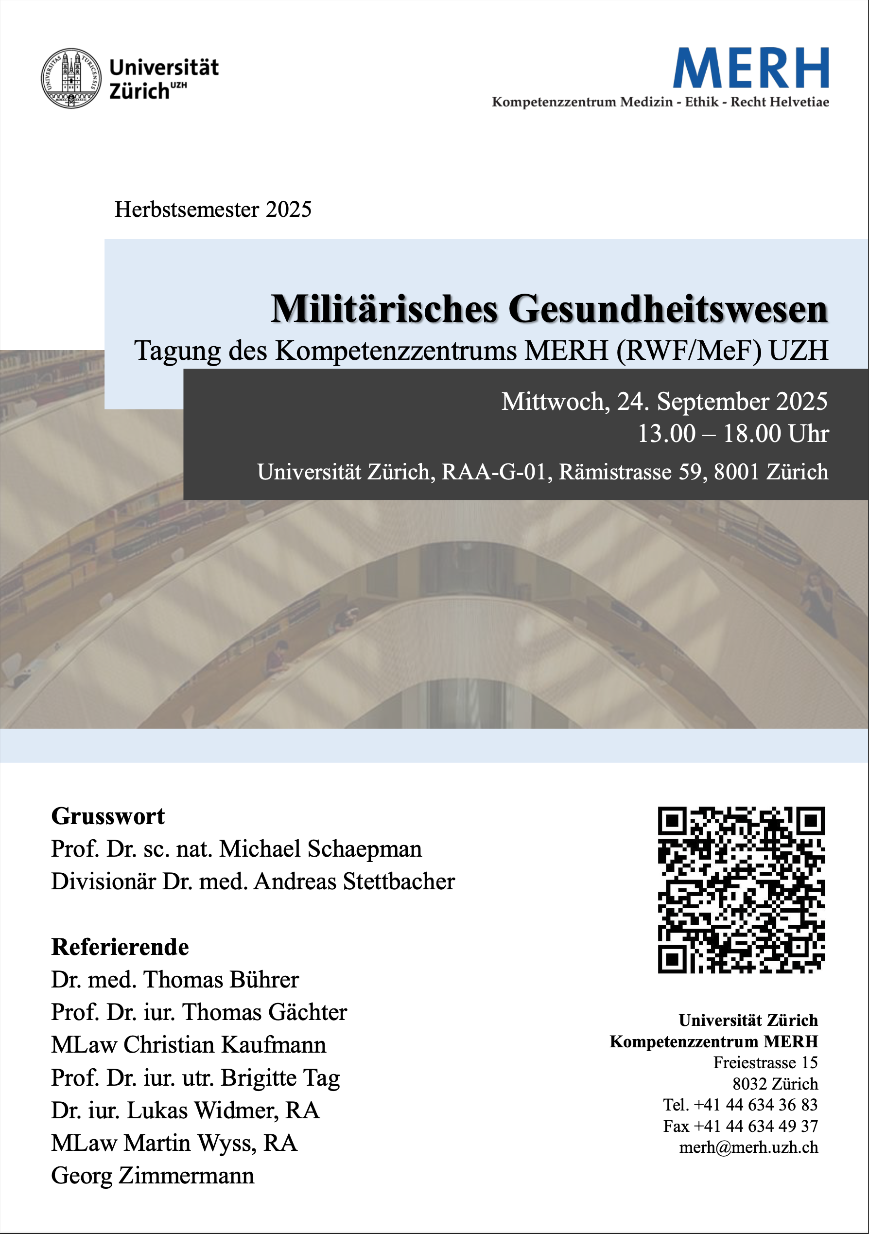 Am 24. September 2025 lädt das Kompetenzzentrum MERH gemeinsam mit der Rechtswissenschaftlichen und Medizinischen Fakultät der Universität Zürich zur Tagung "Militärisches Gesundheitswesen" ein. Im Fokus stehen die rechtlichen, organisatorischen und historischen Grundlagen des Militärischen Gesundheitswesen.