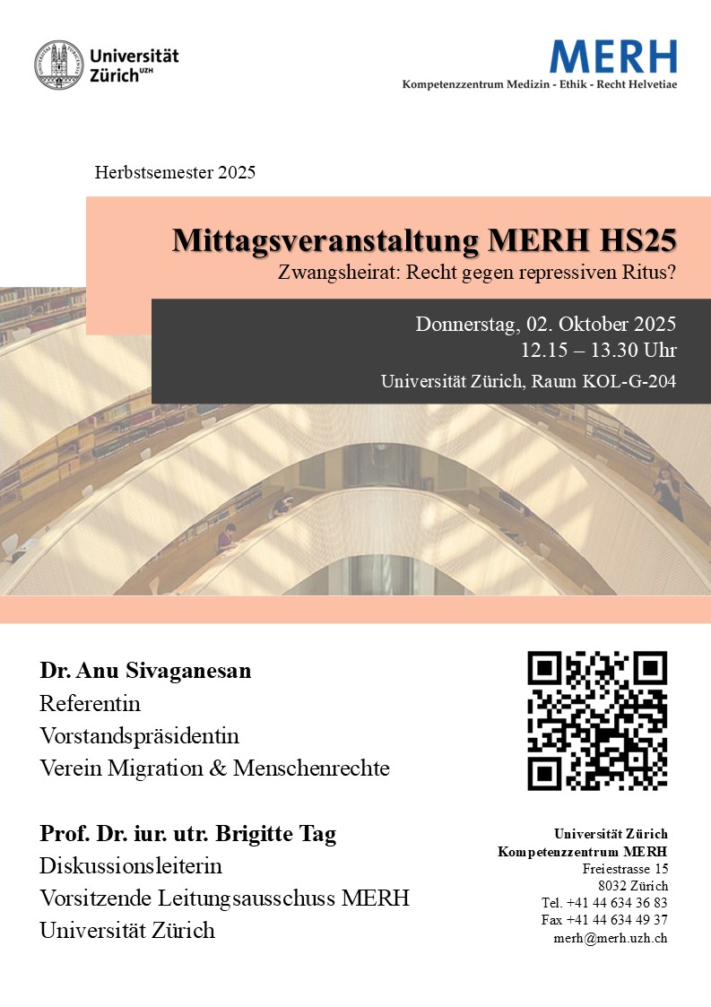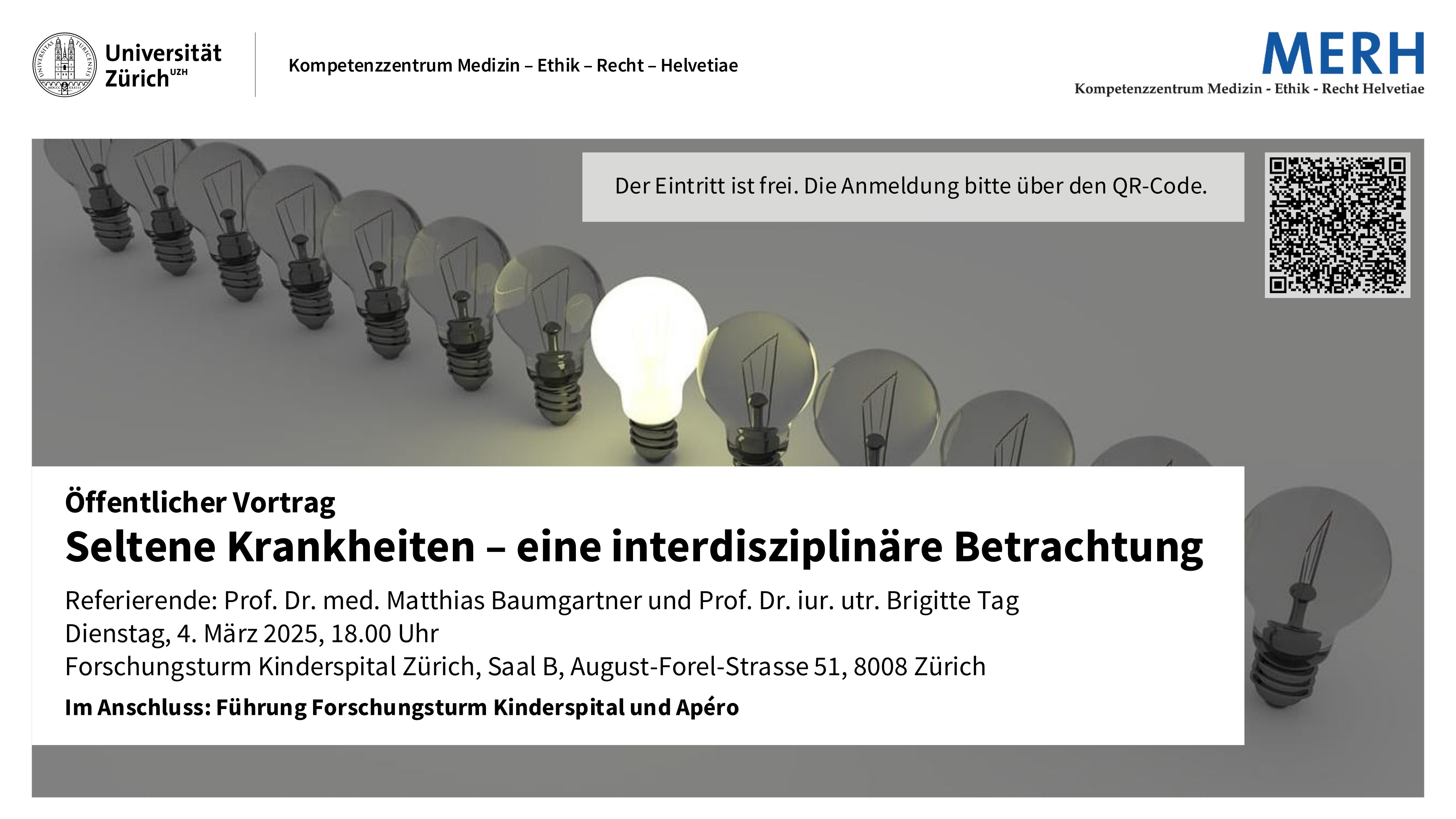 Am Dienstag, dem 4. März 2025, um 18.15 Uhr, werden Prof. Dr. iur. utr. Brigitte Tag und Prof. Dr. med. Matthias Baumgartner zusammen einen Vortrag zum Thema „Seltene Krankheiten“ halten im Vorlesungssaal B des Kinderspitals (KiSpi). Im Anschluss gibt es eine Führung durch den Forschungsturm des neuen Kinderspitals an der August-Forel-Strasse 51, 8008 Zürich, bevor wir Sie zu einem gemeinsamen Apéro einladen.